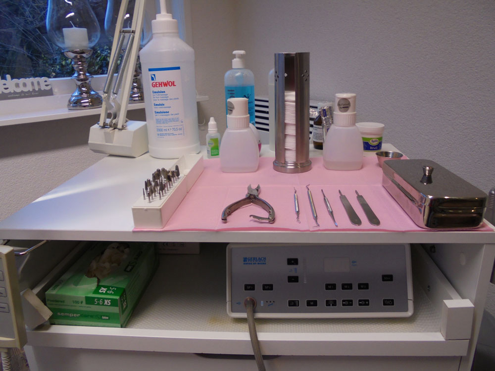 De pedicure praktijk bevindt zich op de begane grond naast het woonhuis. Parkeergelegenheid aanwezig. De ingang is achterom. Het leveren van kwaliteit, hygiëne en klantvriendelijkheid staat op de eerste plaats. Alle faciliteiten zijn aanwezig om mijn beroep goed uit te kunnen oefenen. Ik werk met een pedicure motor van Gerlach(nattechniek). De te behandelen plaats wordt gekoeld en tegelijkertijd nat gehouden. Dit voelt prettig, koel en fris aan de voeten tijdens het frezen. De elektrisch verstelbare behandelstoel biedt comfort tijdens de behandeling. Tevens werk ik volgens de code van de voetverzorger welke is samengesteld door het HBA. In deze code staan de wettelijke eisen en branchenormen met betrekking tot hygiëne, arbo en milieu.